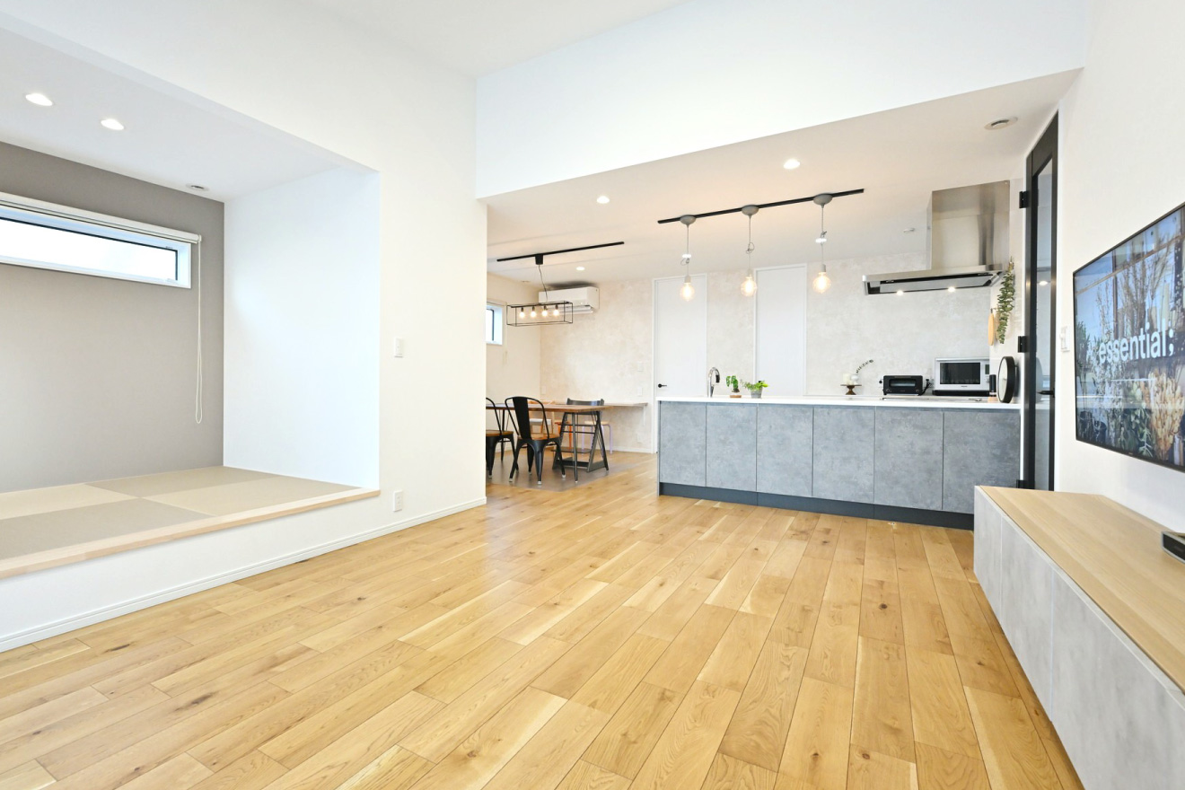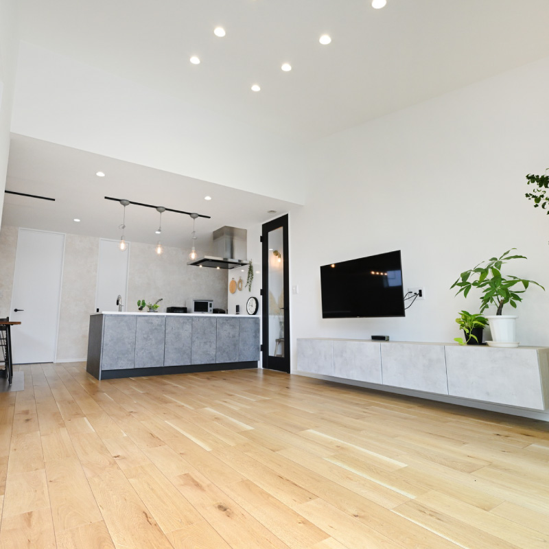 フロートテレビボード+壁掛けテレビとフルフラットキッチン+吊戸棚なしのカップボード、さらに下がり天井と勾配天井の組合せが、スタイリッシュでスッキリとした空間の広がりを感じさせています!