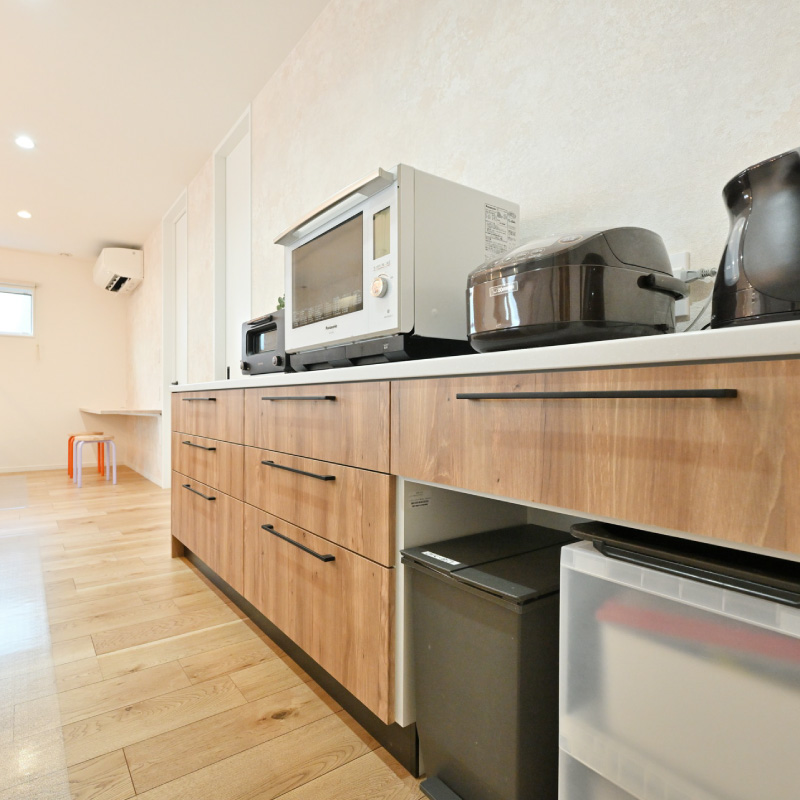 よく使うキッチン家電がずっらと並ぶ背面収納は使いやすくて疲れにくい♪ -