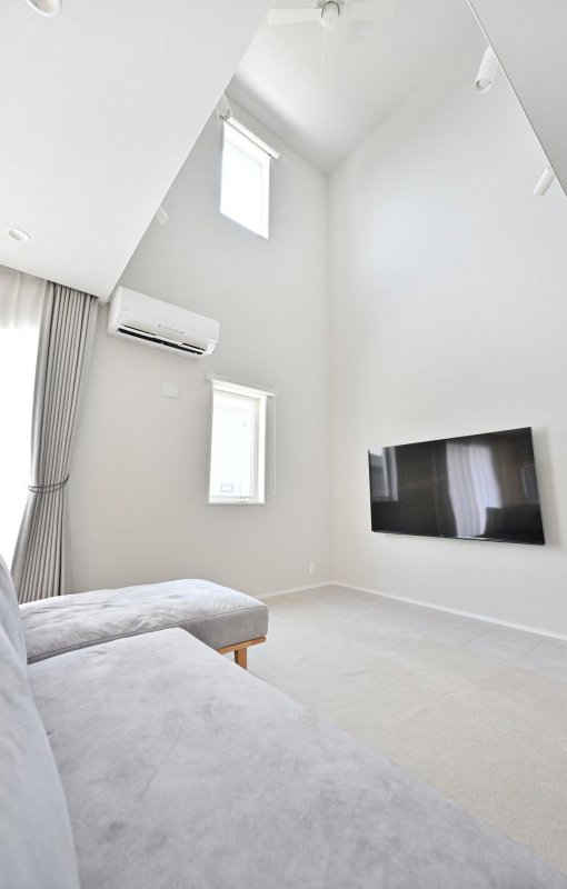 淡いグレー系のカラーで統一したインテリアと壁掛けテレビを採用し、スッキリと広がる空間に明るく柔和な雰囲気を醸し出しています。 -