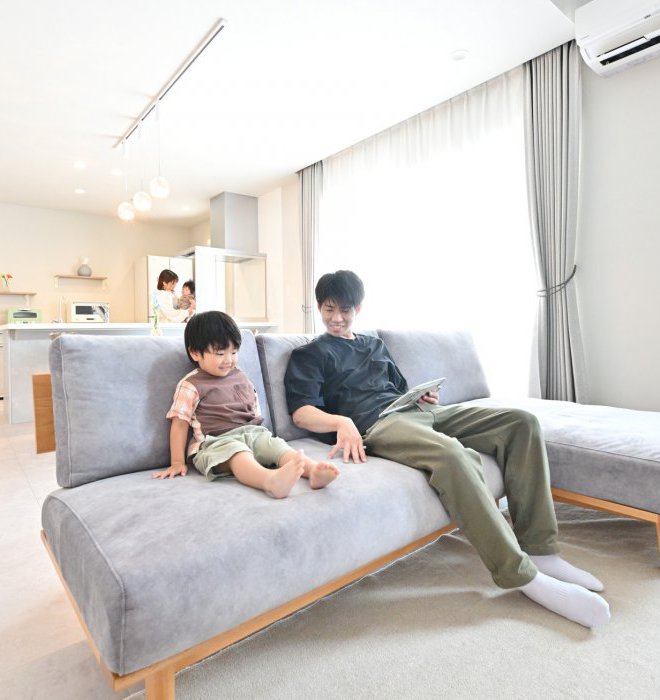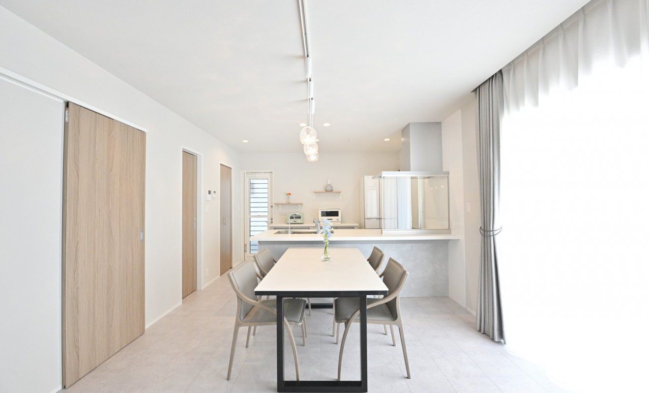 採光が最大限に活用された明るく開放的なリビング空間は、白を基調としたシンプルな色調が清潔感を演出し、広がりを感じさせます。