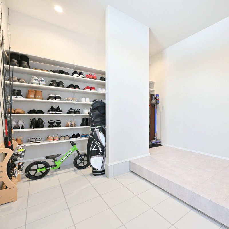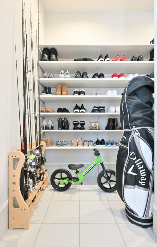 趣味の道具や靴をしっかり効率的に置けるシューズクロークです。