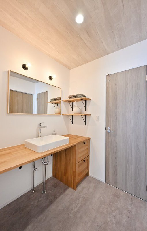 木の温もりを感じられるデザインの洗面化粧台にはキャビネットや棚を設けており、利便性とデザイン性を両立させています。