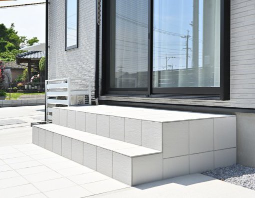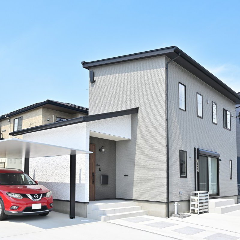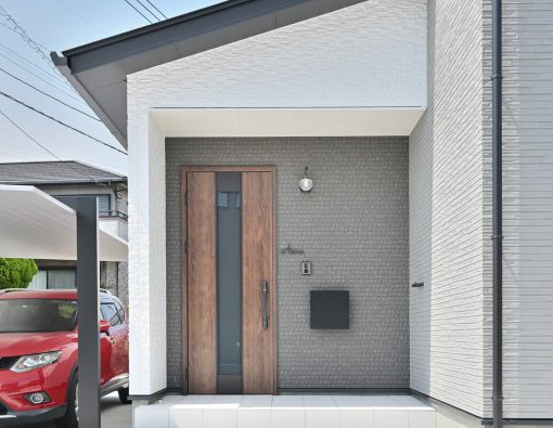 上品なニュートラルカラーを用いた清潔感と統一感のある外観に、A様所有の赤い車がアクセントになっております。