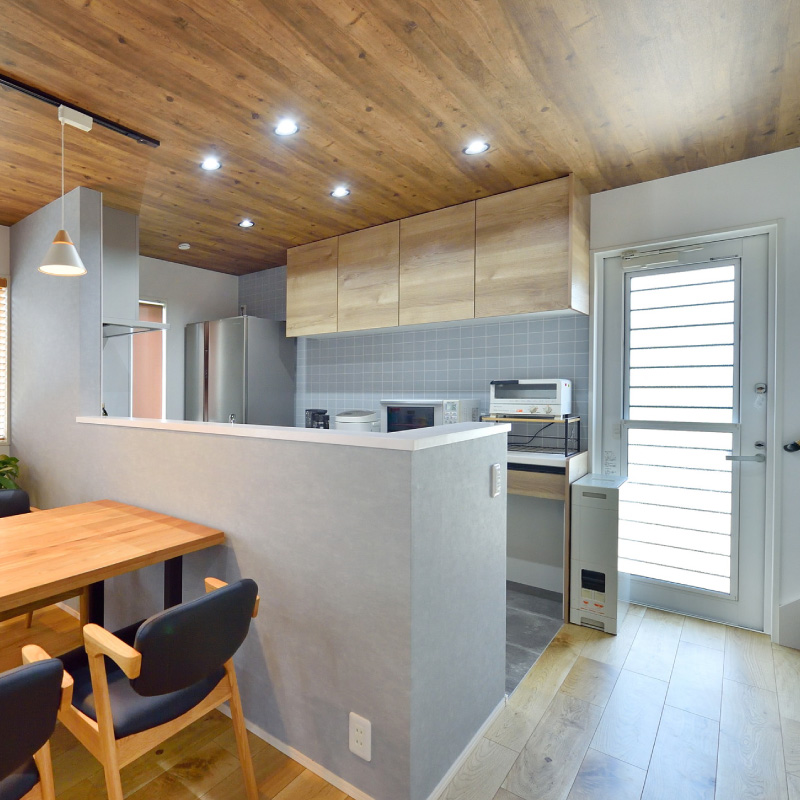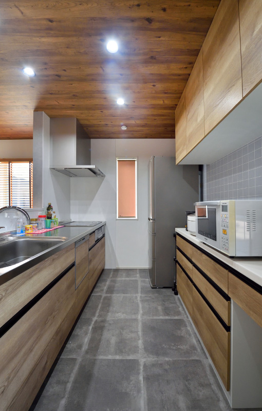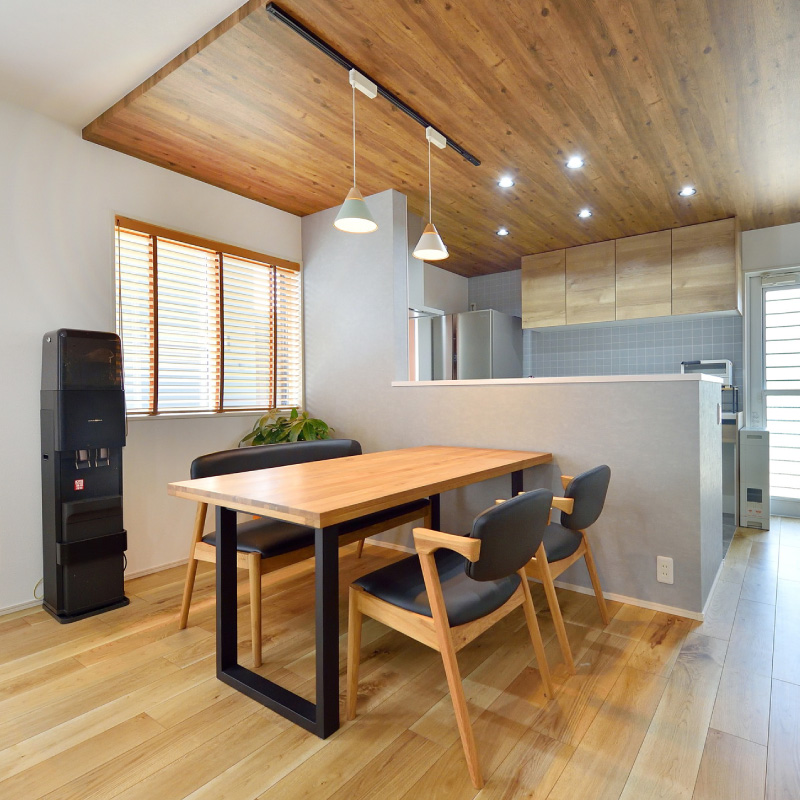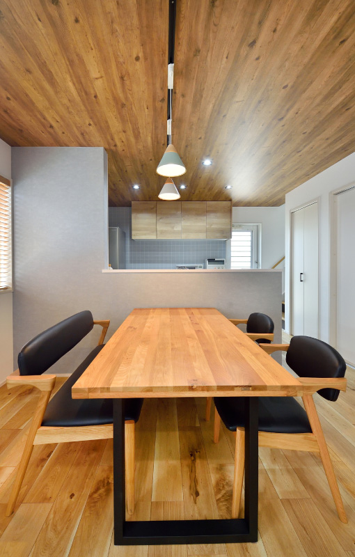 木目の下がり天井とキッチン床のアクセントで空間を分ける演出は、こだわった分満足のいく出来栄えに♪