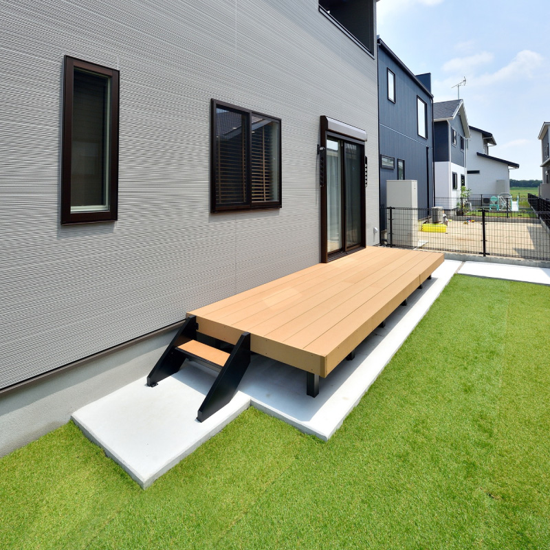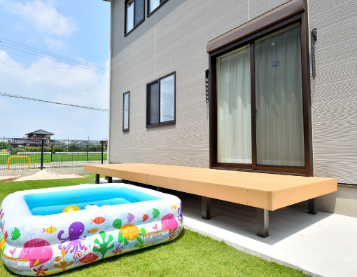 南面にある裏庭には子供が遊べる砂場や広々としたデッキを設置。