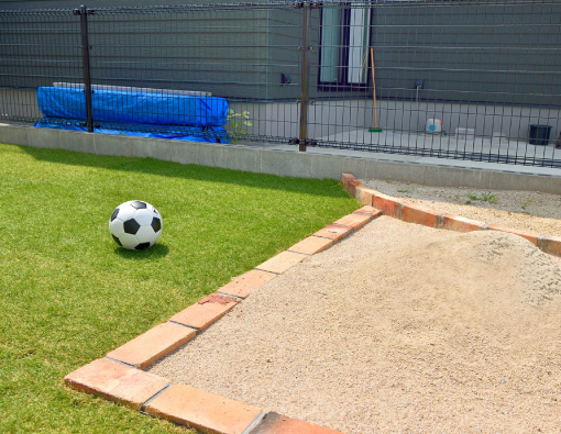 砂場の横と北側駐車場の植栽スペースは実は敷地の鬼門。鬼門は踏まない方がいいとされているので植栽で立ち入れないようにしました。 -