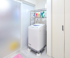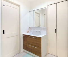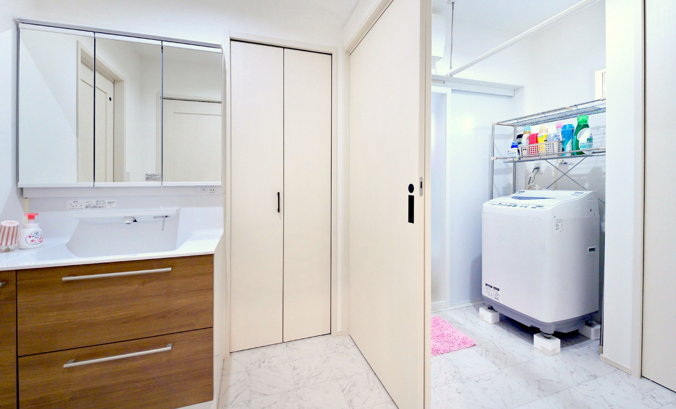 洗面室は階段下収納を利用することで、収納力と動きやすい広い空間を実現。