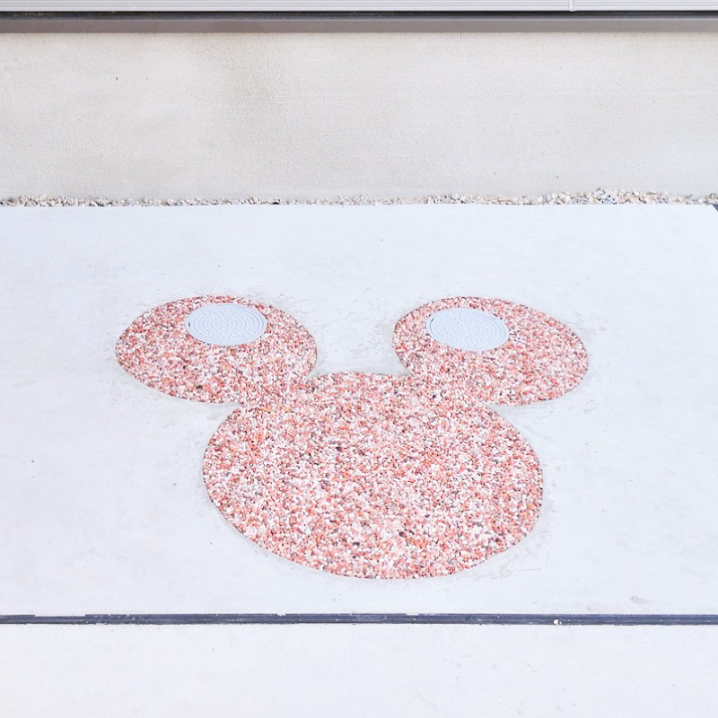 位置決め・デザインは現場監督のアイディア。マンホールの位置を利用してミッキーの耳のデザインの一部に。 -