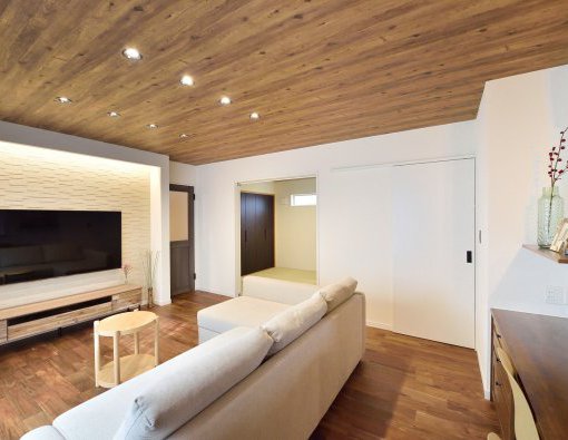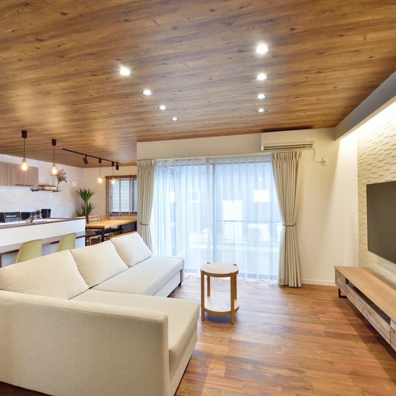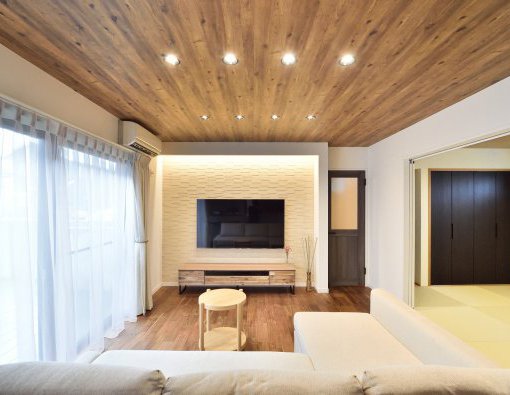 同系色で合わせた床と天井は、カントリーで柔らかな印象を与えます。