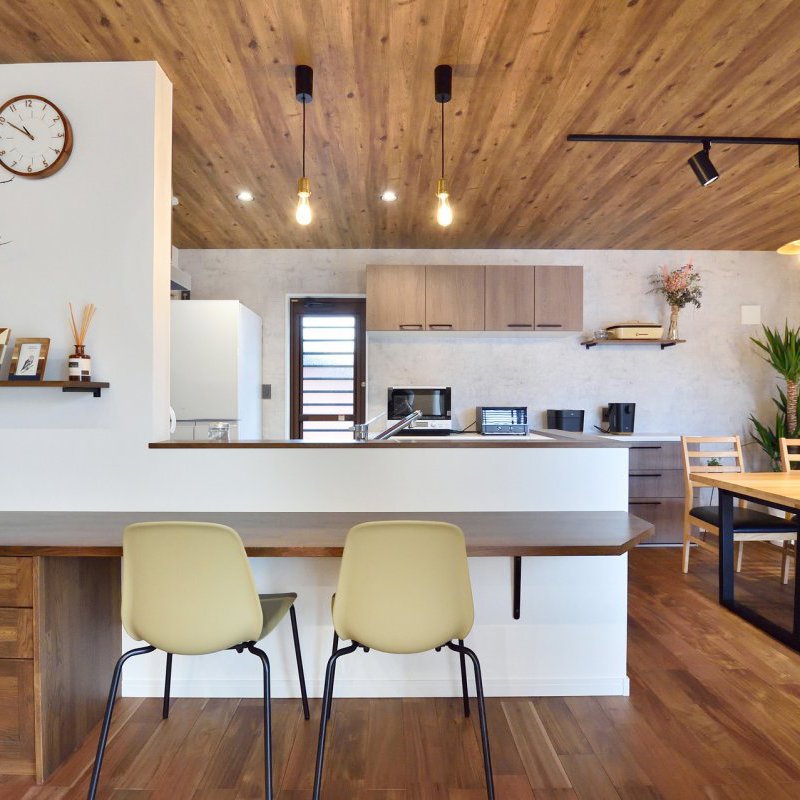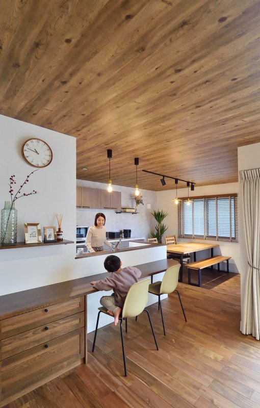 カウンターキッチンで家族のコミュニケーションが増えるカントリースタイルの家