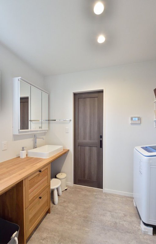 木で造られたオシャレな洗面台に、濃い木目の扉のアクセントが映えます。